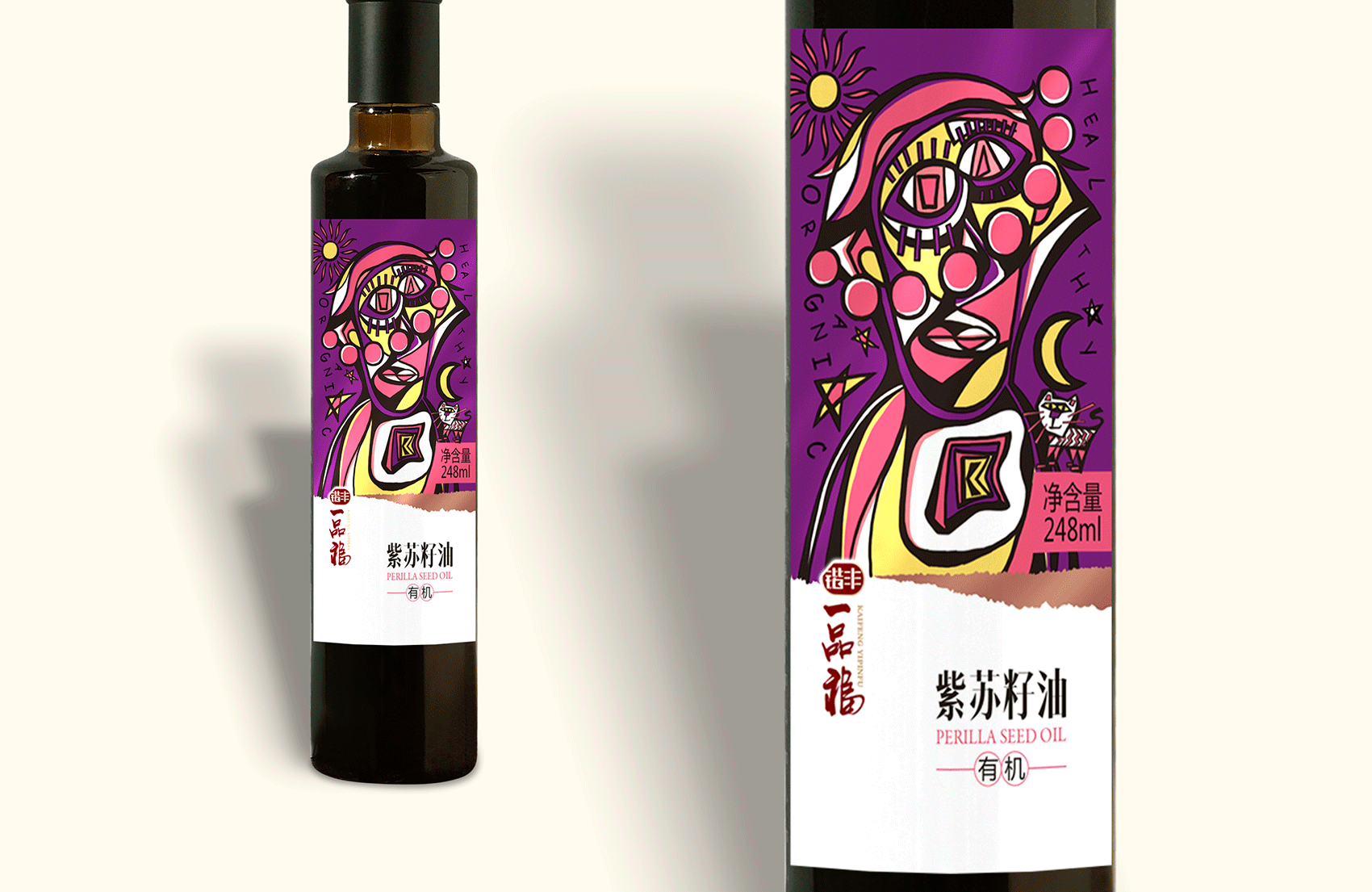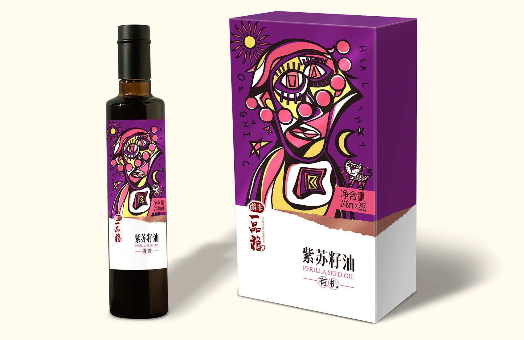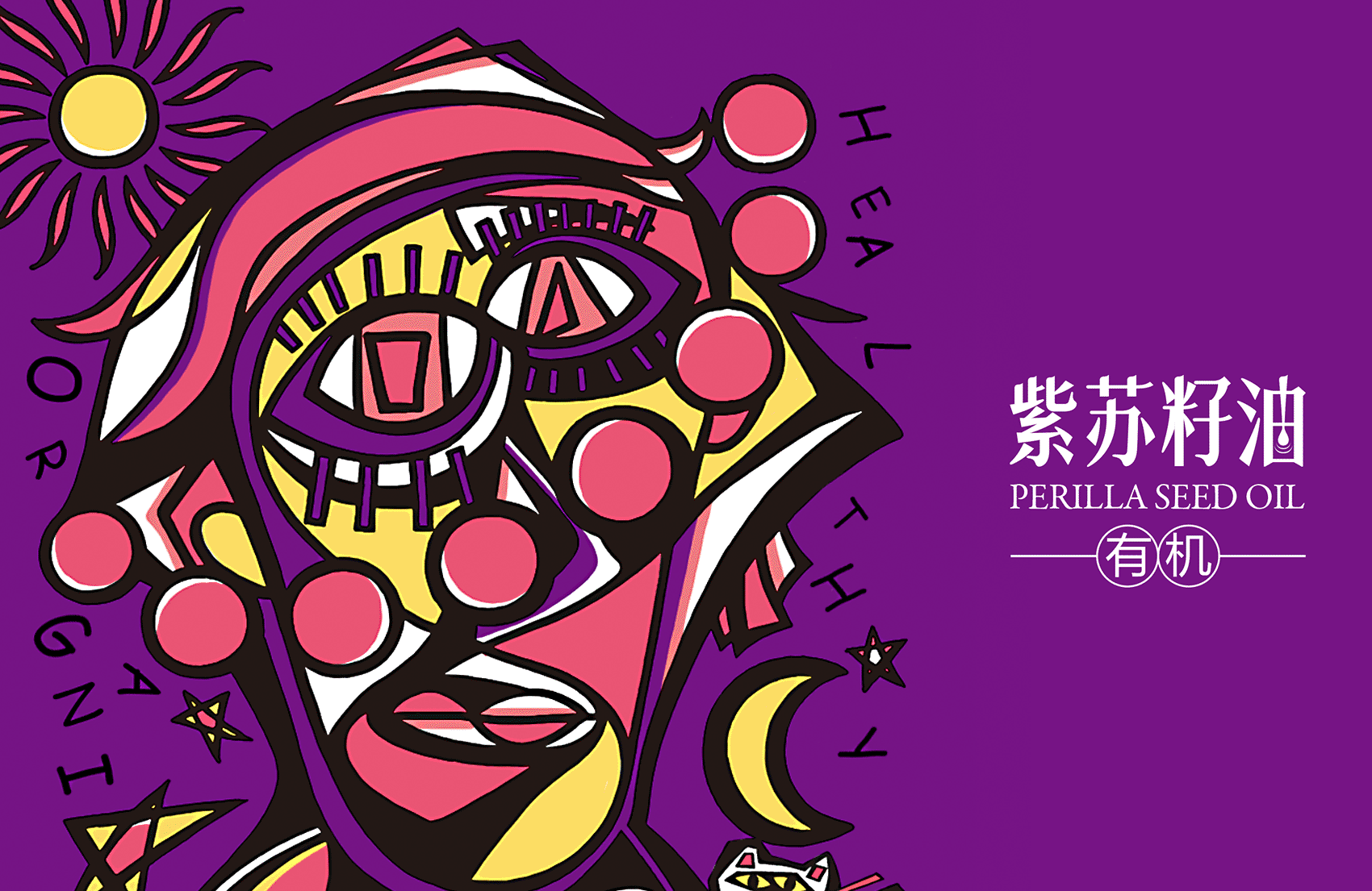 鍇豐一品福有機紫蘇油針對高端市場,定位在精品油范疇,在同質化嚴重的市場環境下僅僅強調產品品質遠不能脫穎而出,繽策搜集大量資料,在經過集體討論和頭腦風暴后,將以抽象藝術的形式作為突破口,將印象派的色調與抽象派的畫風相結合,創造出正在無限想象的大腦的形象,粉紫色的圓形代表著八大行星,象征著正在運動中的自我宇宙,通暢的線條與鮮艷的色塊營造出跳躍感,代表使用紫蘇油后思維開拓,馳騁在幻想中消費者,極具感染力。