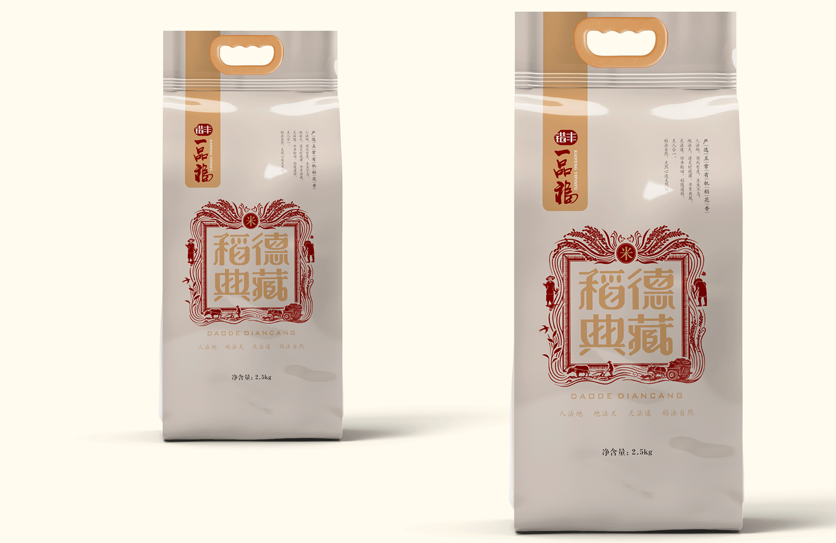 通過大量調研和研究,鍇豐農業旗下產品共同的核心價值是寒地黑土原產作物制品,東北的地緣優勢與敦厚樸實的人文特征是品牌升級的關鍵所在,通過挖掘與稻谷相關的文化,劃分出高中低三擋產品,面對不同受眾將“稻德”、“稻谷”、“品福”三個品牌文化關鍵詞提煉出來,將產品品質與樸實、敦厚相連接,呈現出與眾不同的品牌形象。