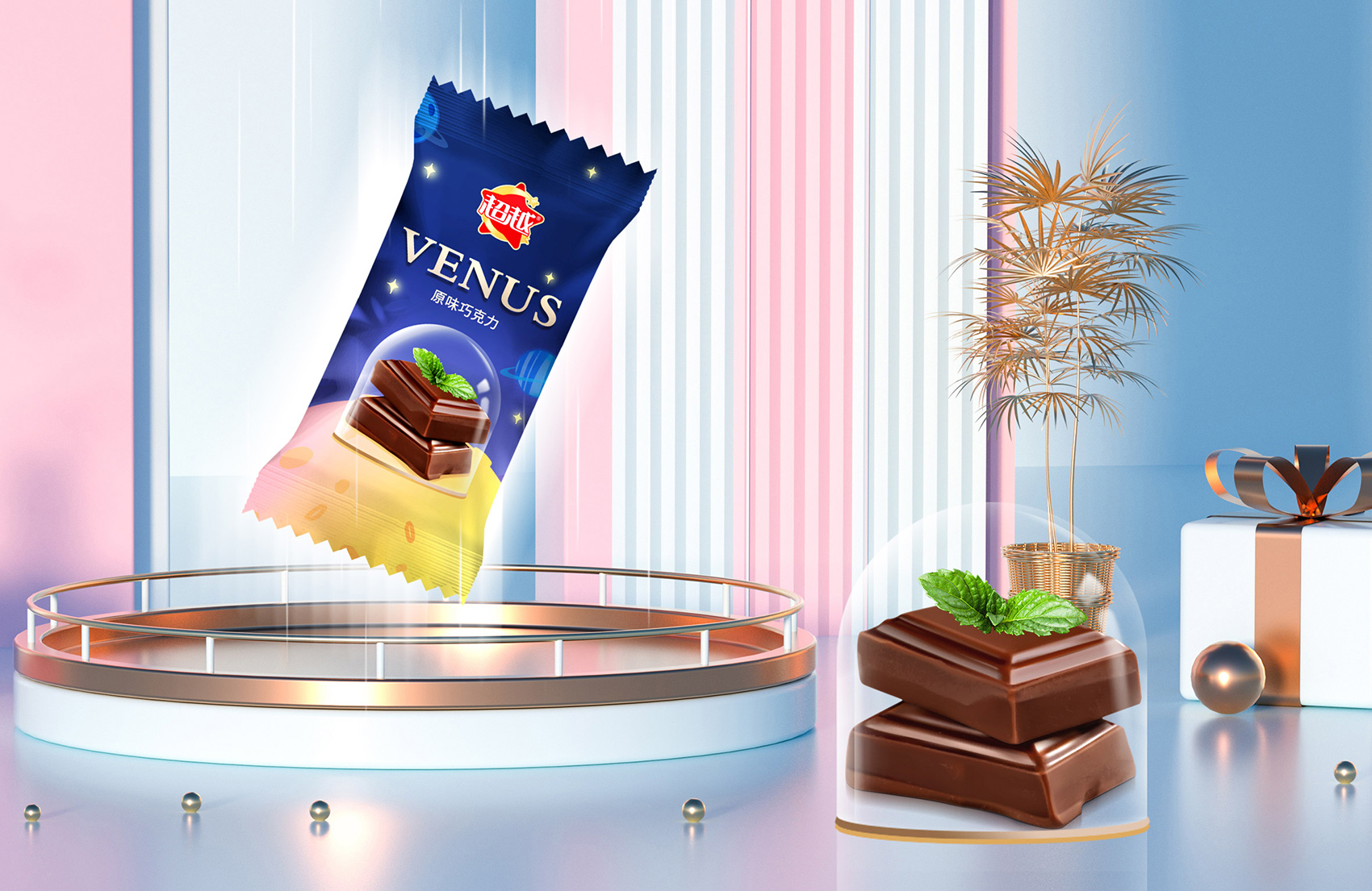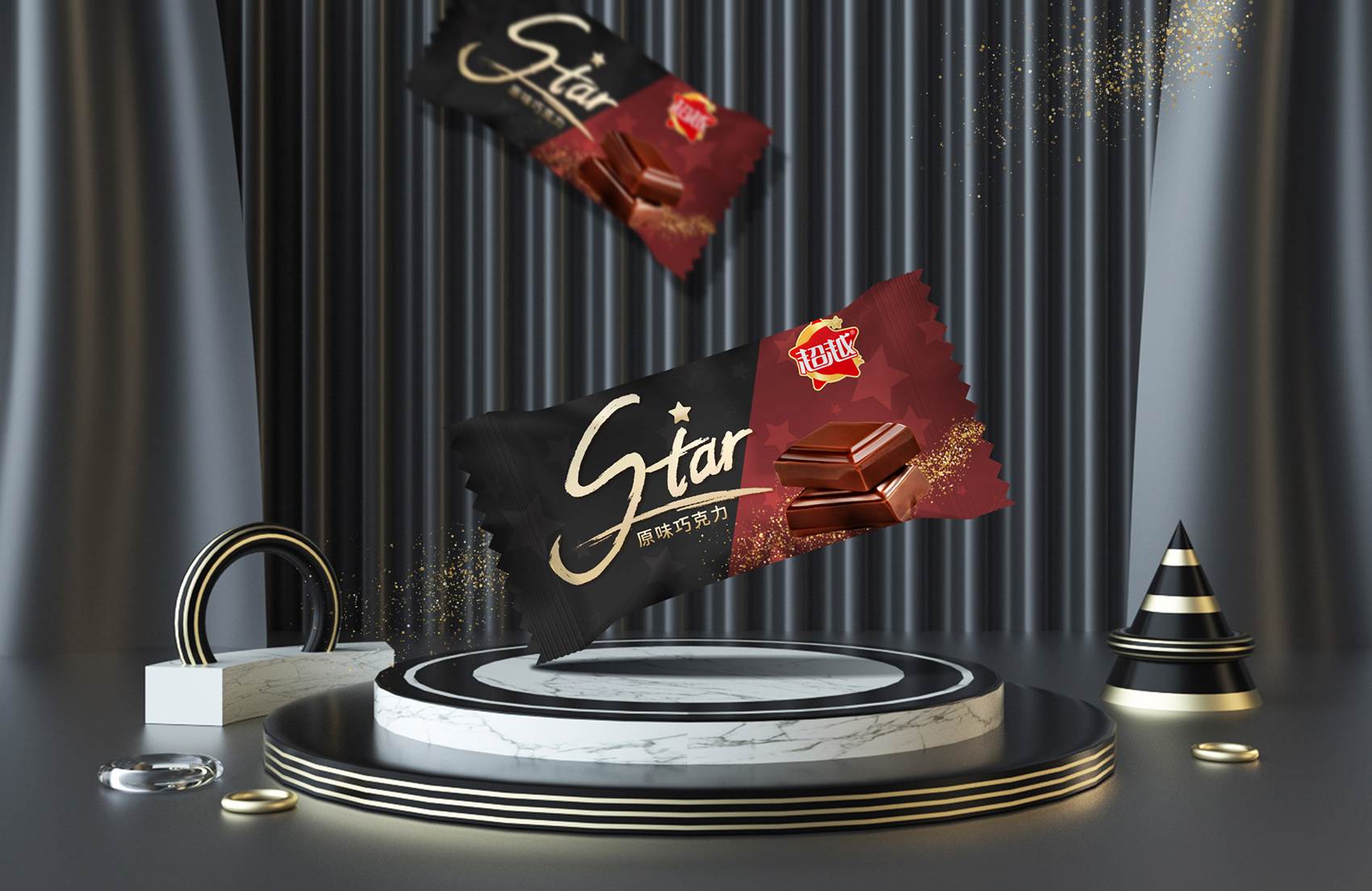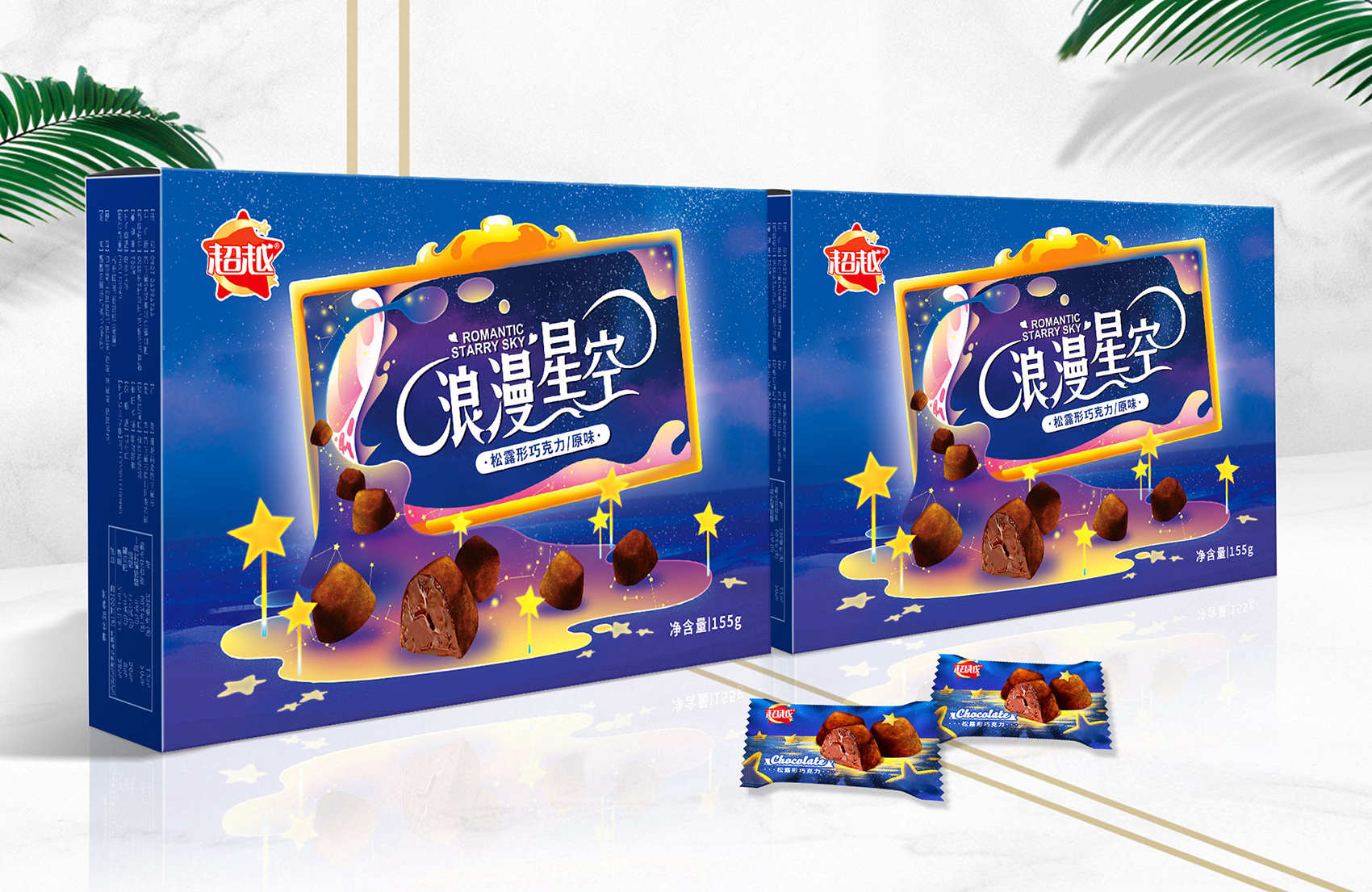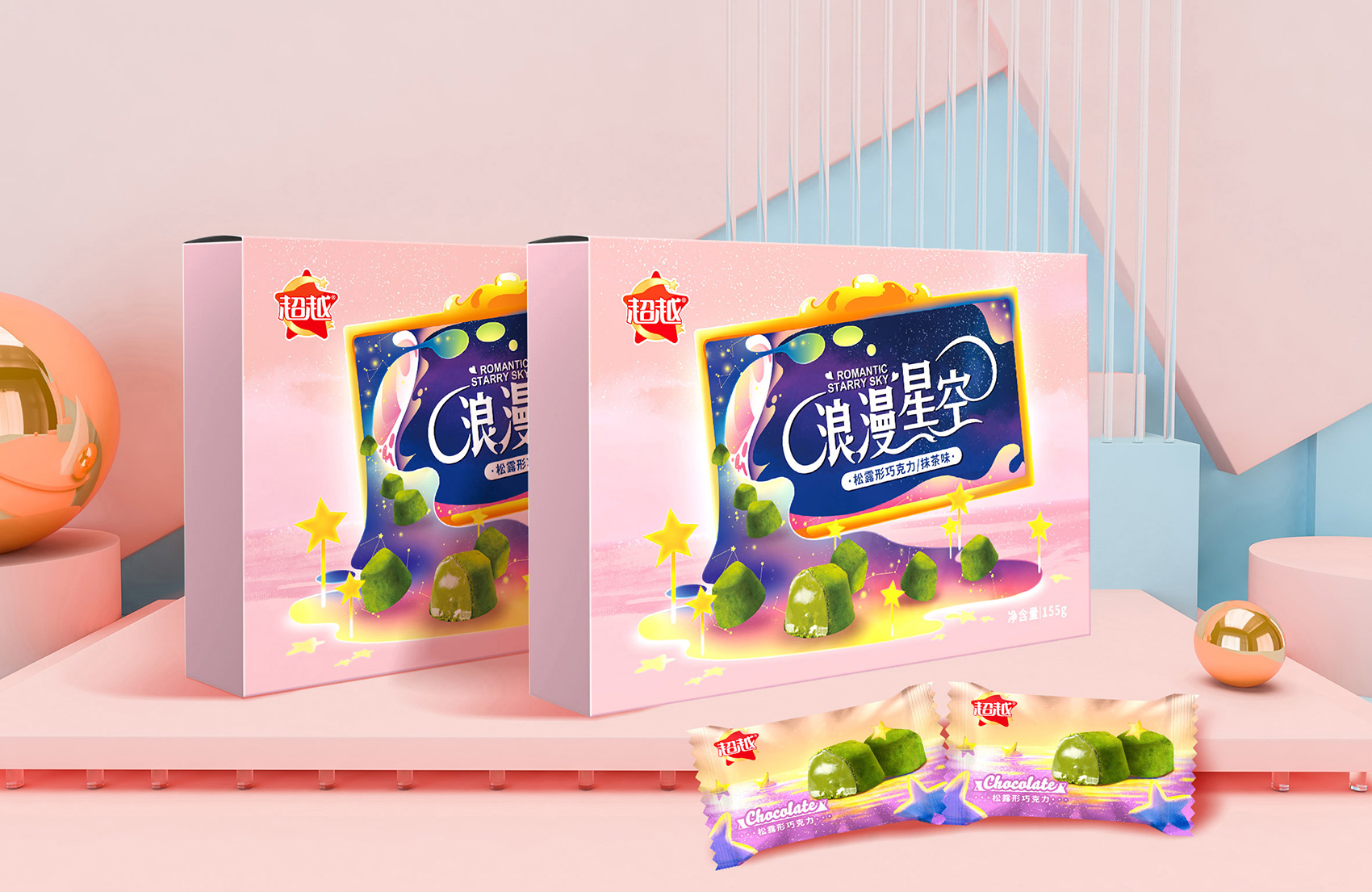 作為巧克力線中的禮盒款,本款產(chǎn)品需要展現(xiàn)出其價值感,繽策以品名浪漫星空進行構(gòu)思,以相框框住浪漫的星空,傾灑而下的夢幻銀河系,星座隨之奔涌,將璀璨的星光帶入心田,恰如甜蜜順滑的巧克力浪漫入骨,星星型的仙女棒點綴其中,增添了活潑時尚的氣息,主色調(diào)選用天空與云霞的漸變色系與金黃的畫框?qū)Ρ弱r明和諧,層次感十足;原創(chuàng)設(shè)計字體加入象征浪漫甜蜜的絲帶與愛心 ,其中浪字與漫字的連接處也可視作兩個比心的手,更加突出包裝的曼妙迷人的氛圍,整體包裝柔和輕快,時尚爛漫,令人過目難忘。
