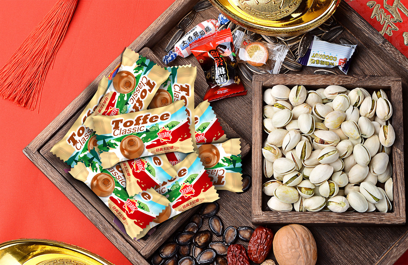 由于品牌品類中傳統(tǒng)中式糖果占比較高,同時品牌精神內(nèi)核也貫徹了傳統(tǒng)勤勞勇敢的要素,所以在通用外包裝上,繽策決定選用融匯古今中外集大成者的國潮等個,配合時下流行的厚涂風格,加入松柏、桃花、祥云等傳統(tǒng)意象使得畫面具有濃郁的中華氣息,品牌IP則換上了京劇頭飾,這一代表這國粹的經(jīng)典符號,讓消費者聯(lián)想到傳統(tǒng)文化;縱向排版形似春聯(lián),與背景中雕花窗欞相互呼應(yīng),在內(nèi)容與形式上達到高度的統(tǒng)一;配色上也遵循了傳統(tǒng)年畫中的大氣華美,絢爛奪目,便于記憶與傳播。